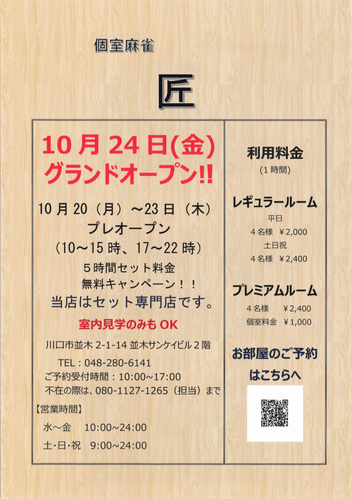 この度は近隣でOPENした【個室麻雀 匠】をご紹介いたします(^^♪